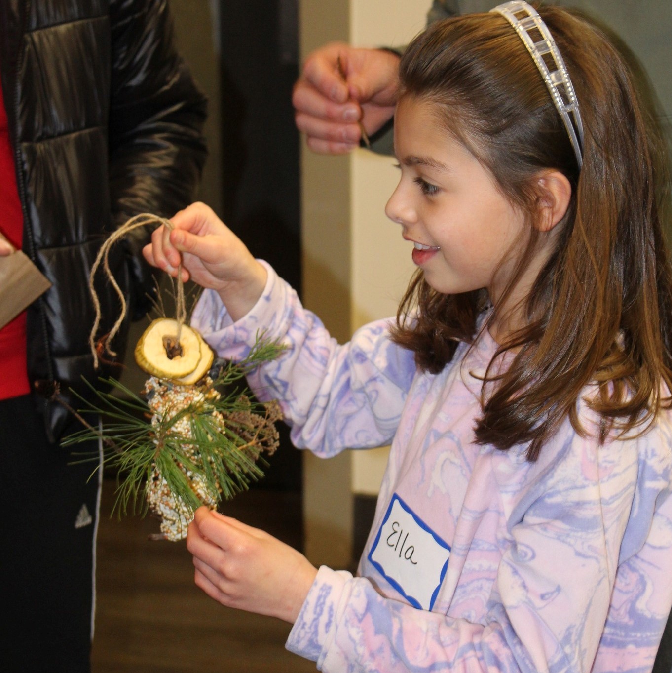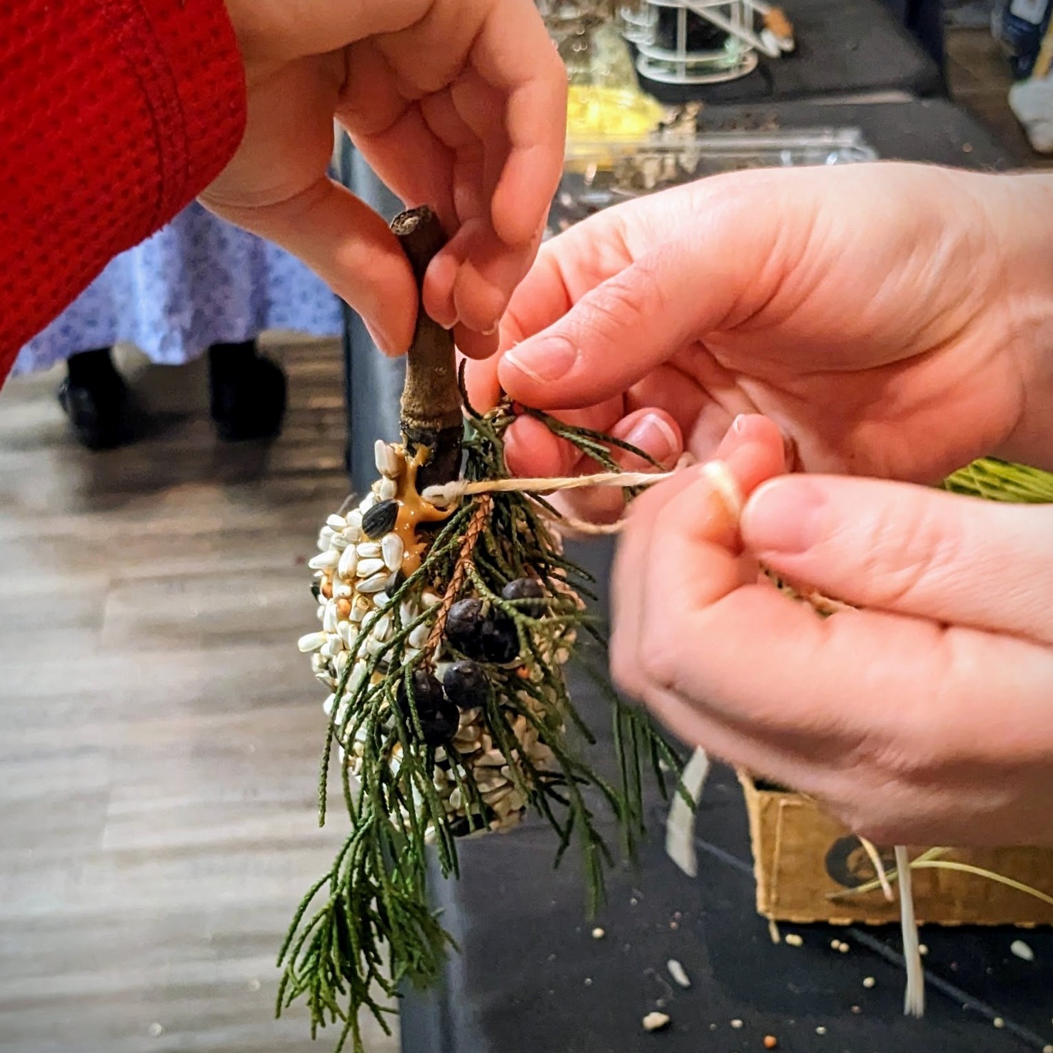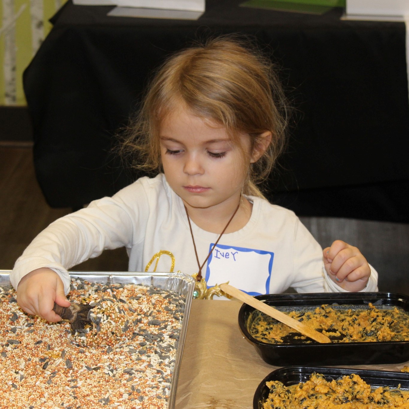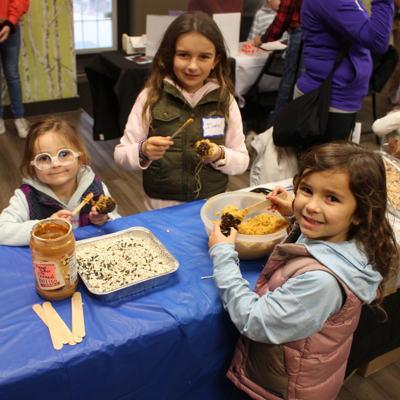Dozens of creative participants worked their way through the River Birch Room at Lost River Cave to pick a pine cone, smear it with bark butter, roll it in bird seed, and decorate it with dried fruits, foliage and other natural objects. The finished products will benefit local birds and contribute to a healthy ecosystem. Many participants also went home with cedar log birdfeeders kindly donated by local optometrist and avid birder, Dr. Kevin Burt.